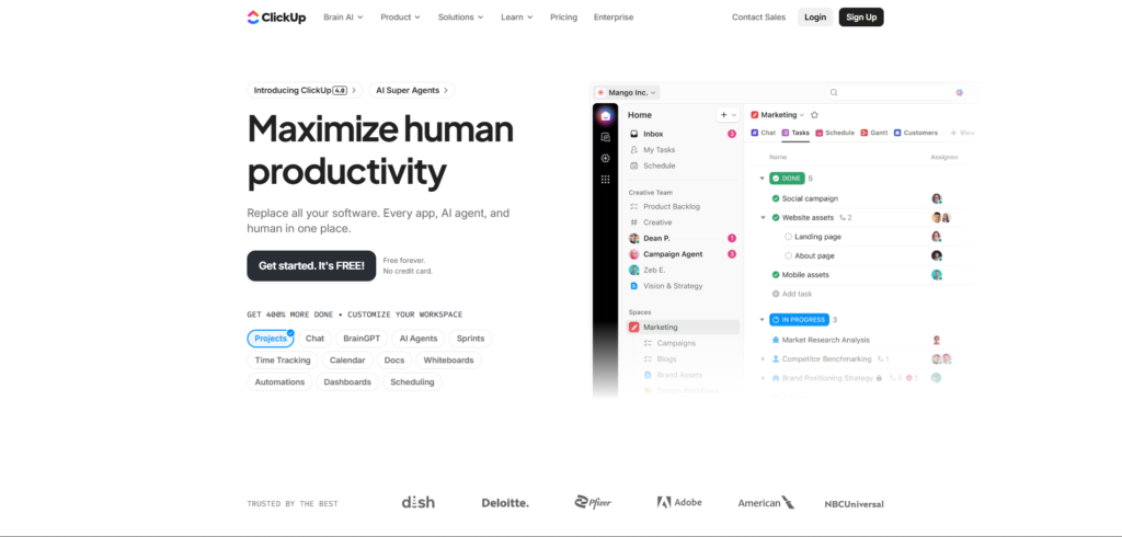 ClickUp tries to do everything. Tasks, docs, chat, it’s all there. The AI is decent for summarizing notes, but as a dedicated Project Planning and Scheduling Software, it’s a bit cluttered. It’s better for people working in an office than people wearing hard hats.
